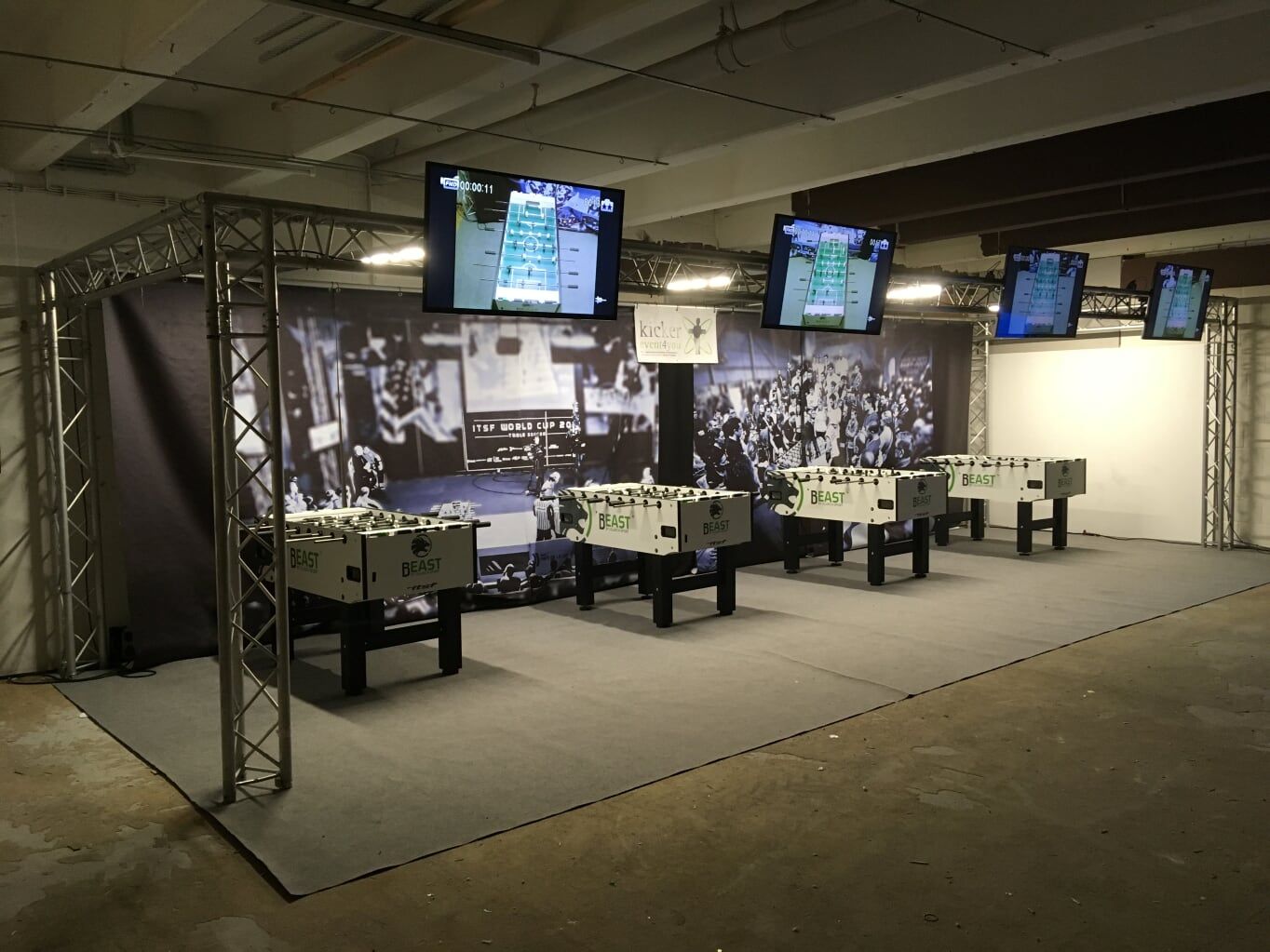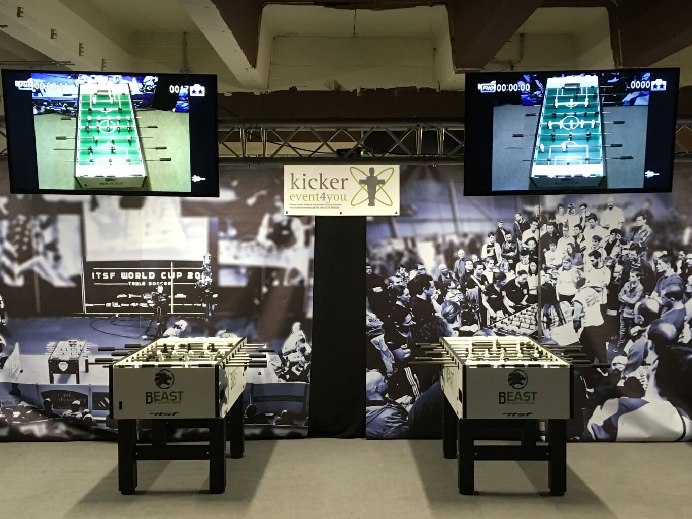 Bei kickerevent4you mieten Sie professionelle Kickertische. kickerevent4you verleiht zertifizierte ITSF (Internationaler Tischfußballverband) oder DTFB (Deutscher Tischfußball Bund) Kickertische für Ihre professionelles Auftreten und gewährleistet damit den Erfolg der Veranstaltung da diese Tische speziell für den harten Einsatz im Ligabetrieb oder auf Meisterschaften ausgelegt sind. Ob einzelne Tische oder 100 Tische für Ihre Großveranstaltung. Alles ist möglich. Auch die passende Beleuchtung können wir bereitstellen. Natürlich bieten wir Ihnen auch die Logistik inkl. Transport, Auf- und Abbau.